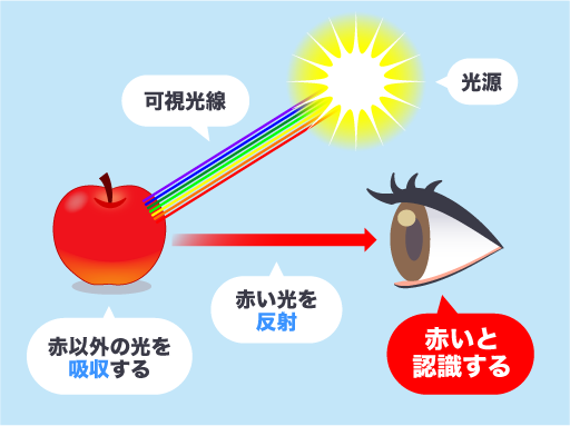 例えば光がリンゴにあたると、リンゴの表面では短波長(青)の光と中波長(緑)の光が吸収され、長波長(赤)の光が多く反射されます。この長波長(赤)の多い光が目にとどくことで、私たちは目の前にあるリンゴが「赤い」と感じるのです。