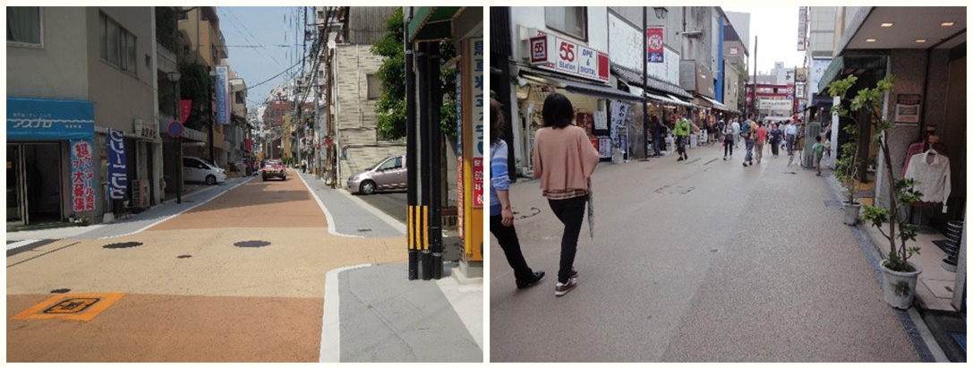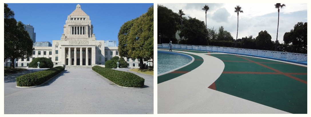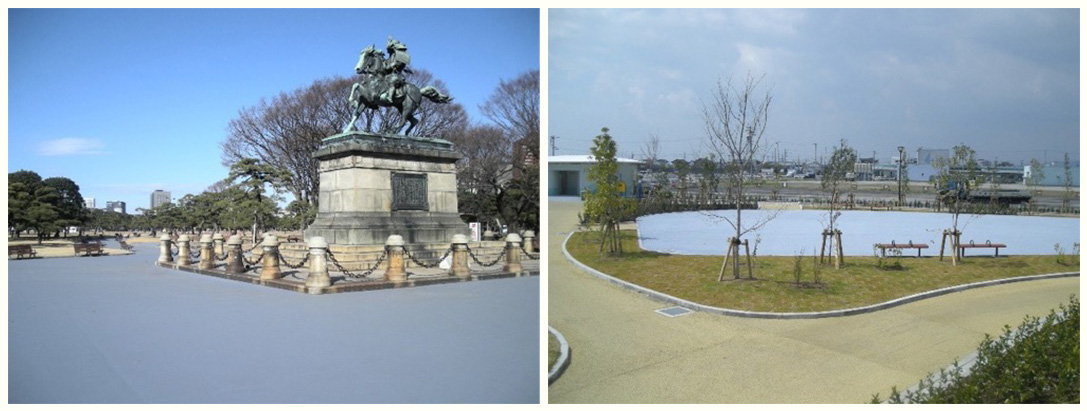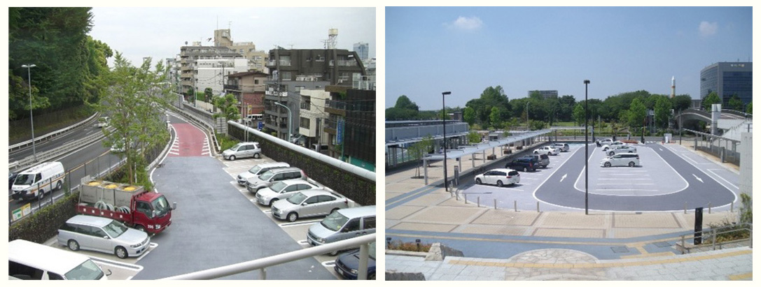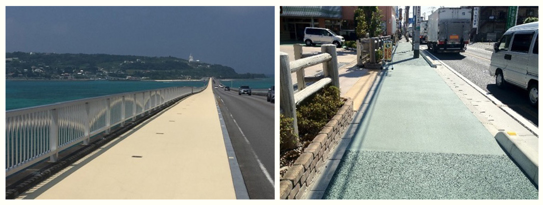 一般の車道に限らず、空港の誘導路でも効果があったという事例があります。数百トンもある旅客機が頻繁に走行する誘導路には大きなわだち掘れが出来てしまうのが一般的ですが、遮熱性舗装を施した誘導路ではわだち掘れの深さが二分の一以下に抑えられ、しかもその効果が4年以上も持続することが確認されています。