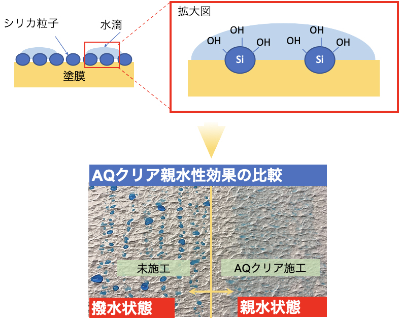 AQクリアは4~6個/n㎡のシラノール基(Si-OH)が粒子表面に存在し、シリカ粒子表面のOH基が塗膜へ親水性を付与します。