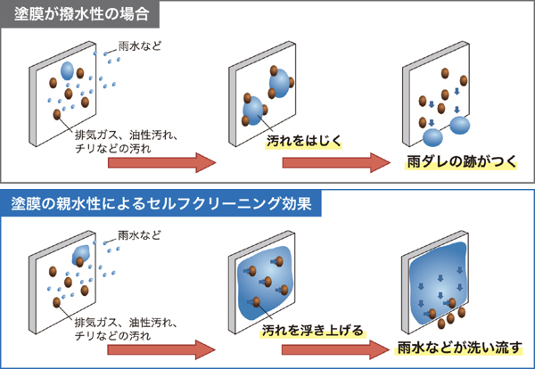 ミラクールAQクリアが乾燥した後は、すぐに塗膜が親水性を帯びるため、雨が塗膜に馴染み、塗膜に付着した汚れを洗い流してくれます。